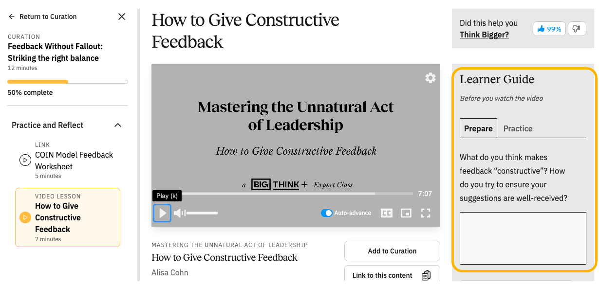 Remember, Prepare and Practice questions are available in the Learner Guide for each Big Think+ Lesson so you don’t have to create anything new.