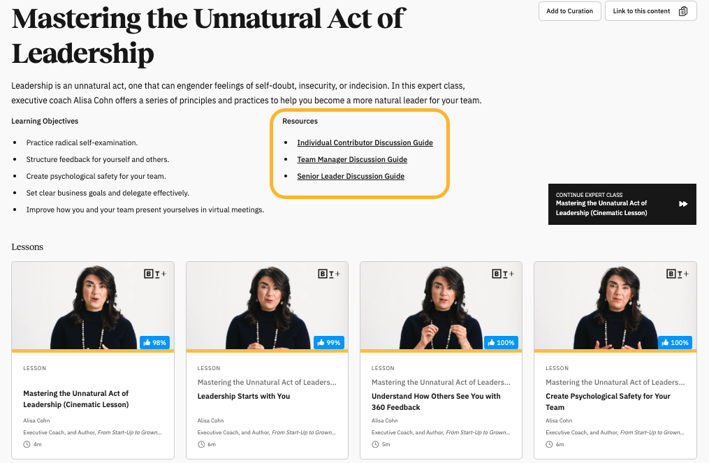 Big Think+ can be a thoughtful complement to instructor- or facilitator-led experiences for both in-person and virtual sessions. Using microlearning lessons as a complement to or in these sessions is a great way to “invite an expert” into the room, and can introduce fresh perspectives, create shared language, and spark more meaningful dialogue.