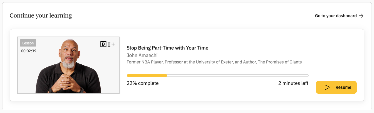 Big Think+ keeps a record of everything you’re learning right in your Dashboard, making it easy to see what you’ve completed and to return to any content you’ve started.