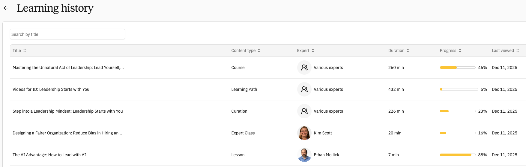 For a full view, the Dashboard also links to your Learning History, where you can browse your entire record of in-progress and completed content in table form.