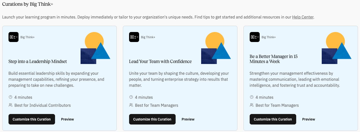 Sample of an available Curation by Big Think+Curations by Big Think+ will help build your employees' ability to lead and succeed whether they are an aspiring, emerging, current, or senior leader/manager. Multiple options are available for when: